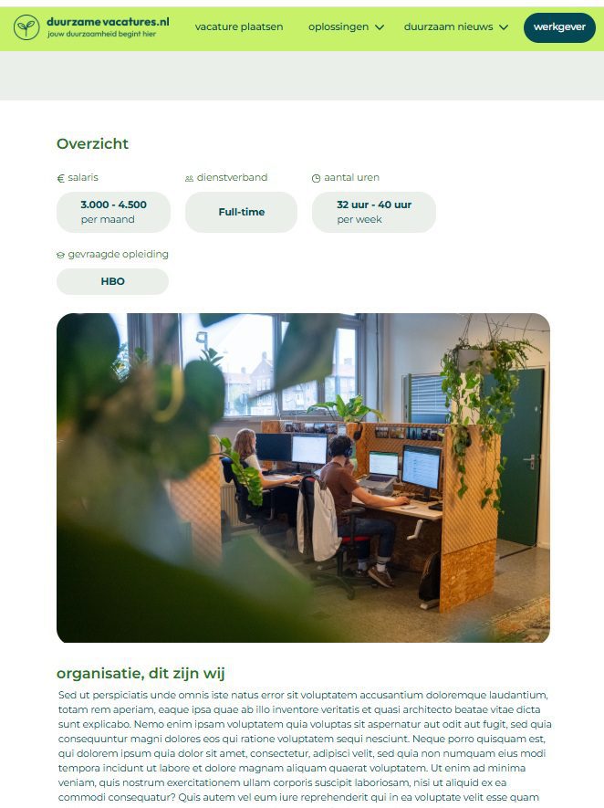 Professionals op duurzamevacatures.nl zijn op zoek naar een betekenisvolle baan. Als buitenstaander is het niet altijd direct duidelijk wat een functie precies inhoudt. Het helpt daarom om de duurzame impact van de functie duidelijk en concreet te maken. Geef dit in de eerste alinea’s al aan, hierdoor leest de mogelijke sollicitant eerder door en wordt sneller enthousiast en overtuigd.